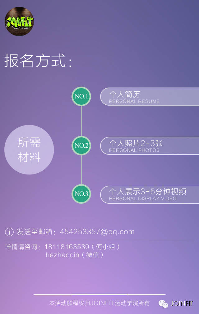 你还在做一个默默无闻的教练吗?你想成为万众瞩目的明星教练吗?JOINFIT现为你提供展示的平台,你还等什么呢?有梦想就要追逐!拼搏,梦想才会成真!JOINFIT此招募令一经发出,吸引了业内无数精兵强将的广泛关注,纷纷跃跃欲试,一瞬间教练简历如雪片般塞满JOINFIT公司邮箱。