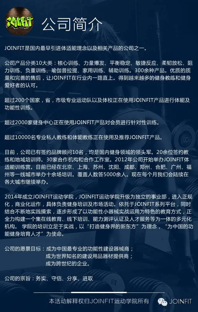 JOINFIT品牌始创于2006年,是国内最早引进体适能理念以及相关产品的公司之一。公司创始人之一PITOS早年在美国从事健身用品行业,发现在国外早已普及的功能性,易用性,便携式健身小器械在国内当时几乎是个空白。由此萌生了将国际流行有效的体适能运动理念和器材同步引入中国的想法。公司经过长达9年的市场品牌运作及发展,无论在业务广度及深度上均得到了全面提升,公司坚持秉承以人为本、科技兴企的宗旨和诚信为本、追求卓越的理念;坚持与时俱进、开拓创新的作风和简单、高效、执行的管理思想;追求质量第一,服务第一的目标。现已发展成为业内领军企业。